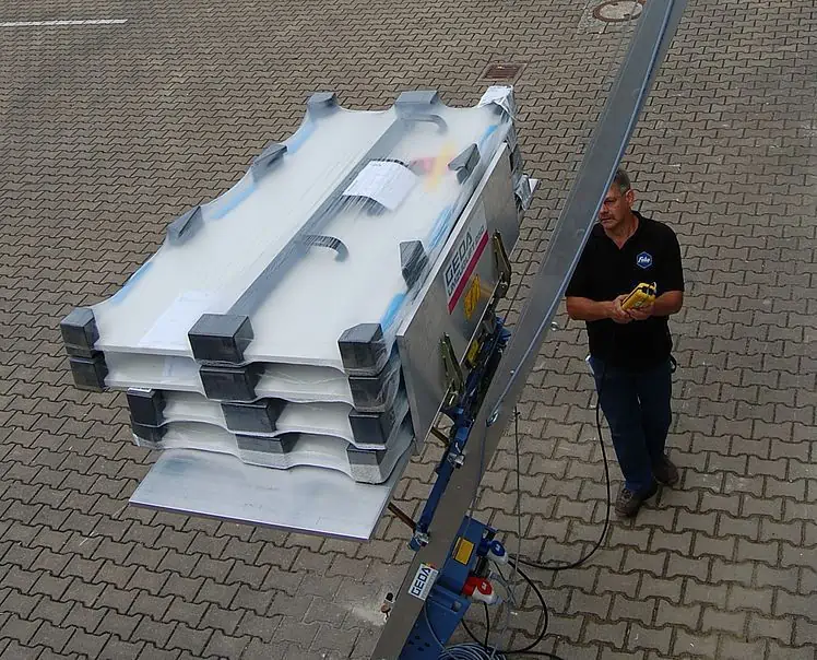 The construction of GEDA’s Ladder Lift is so easy that even unschooled workers can perform the assembly, resulting in reduced costs. With the help of massive threaded bolts, the ladder elements are assembled on the ground – without any tools. First, the rails for the inclined elevator are pushed on the ladder profile. As soon as the ladder system is mounted on the scaffolding or the façade, the hoist is set on top of the profile. Support beneath the ladder secures the elevator’s weight and the transport of goods. Thanks to the various load handling attachments, every material can be moved.